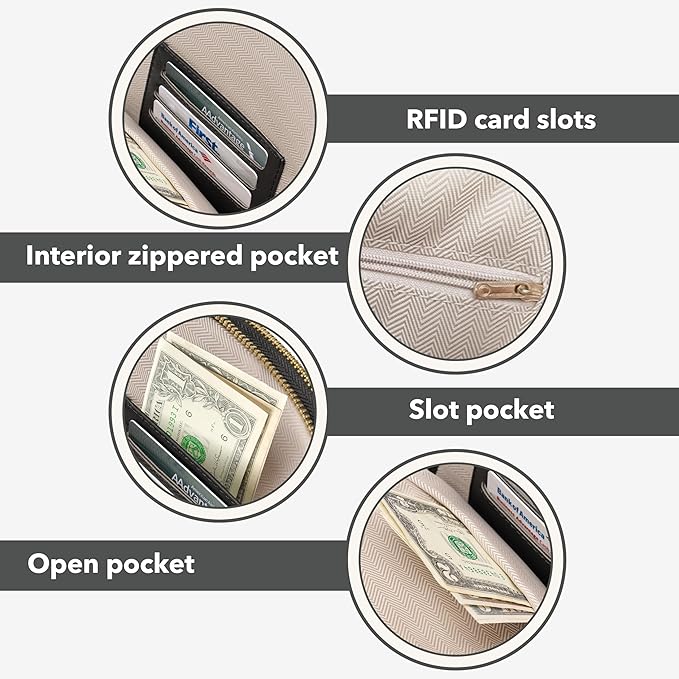 - Multiple Compartments: Includes 2 main zippered pockets, featuring 3 RFID card slots, 1 slot pocket, 1 interior zippered pocket, and 1 open pocket. Additionally, it has an anti-theft back zippered pocket and a front zippered pocket. The main zipper pocket is designed with a wide opening for easy access to your belongings. The storage is excellent—you can fit your phone, glasses, credit cards, cash, and lipstick, all while easily finding what you need in the separate compartments.