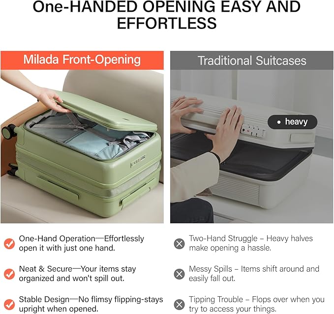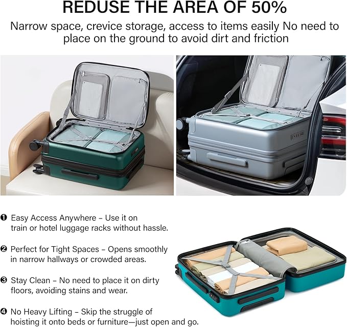 - 【ONE-Handed Opening】Top opening carry on luggage design, the new front opening and closing method to open or close the travel trunk luggage effortless to liberates your hand. Reduse the area of 50% saving space, you can open it in any crowded place and making access to your belongings a breeze. Integrated deep storage design has spacious main compartment keep you packing luggage conveniently and organized during your journey