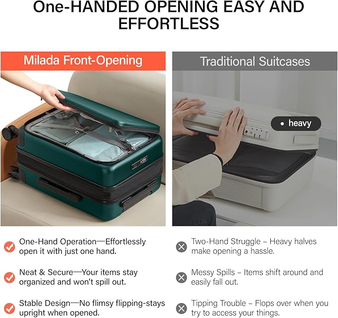 - 【ONE-Handed Opening】Top opening carry on luggage design, the new front opening and closing method to open or close the travel trunk luggage effortless to liberates your hand. Reduse the area of 50% saving space, you can open it in any crowded place and making access to your belongings a breeze. Integrated deep storage design has spacious main compartment keep you packing luggage conveniently and organized during your journey