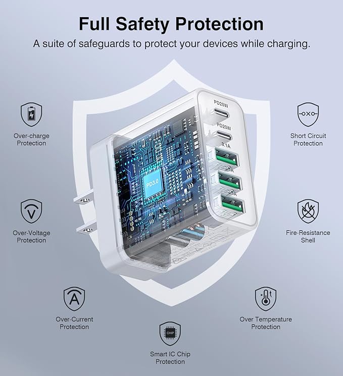 - Portable and Compact Design: 5-in-1 USB C wall charger is lightweight and compact, making it easy to carry in pockets, bags, or on-the-go. USB C plug adapter is made of lightweight materials, ensuring a hassle-free experience during travel. It supports 100-240V voltage input, making it perfect for international travelers