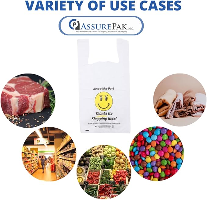 - 400 Smiley Face T-Shirt Bags – Bulk Pack: Includes 400 white HDPE plastic bags with a cheerful happy face print — perfect for retail stores, takeout, groceries, and daily business use.