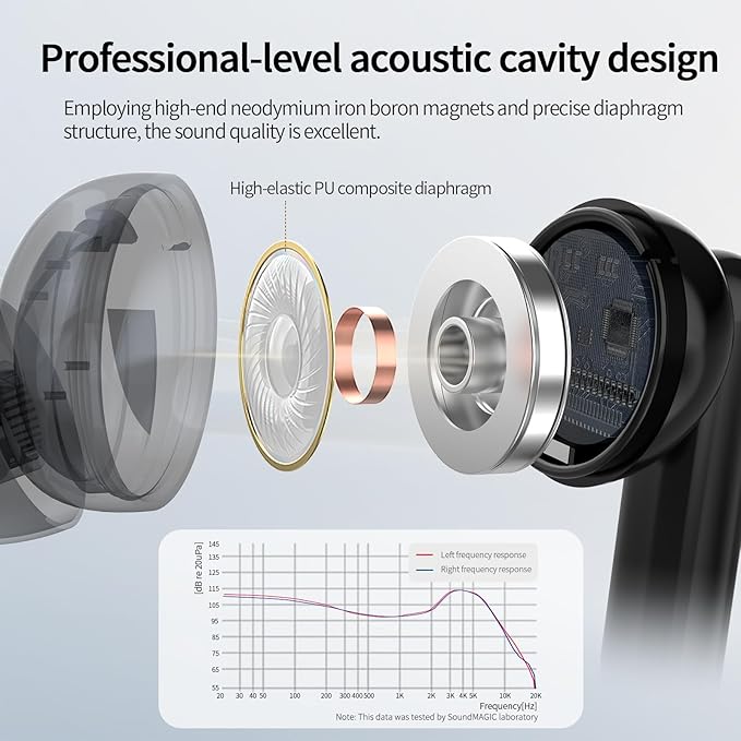 - 【Good and Comfortable Noise Cancellation 】 The SoundMAGIC T80BT ANC true wireless earbuds feature a high-performance noise-canceling chip that uses dual microphones to capture ambient noise inside and outside the ear. The ANC chip then generates an inverse signal to drive the speaker, producing sound waves that cancel out noise for superior noise reduction. By selecting the right-sized silicone ear tips, you can achieve better passive isolation and enhanced bass response, while active noise cancellation (ANC) performance is further optimized. With a maximum noise reduction depth of -38dB, these earbuds meet the demands of listening in even the noisiest environments.