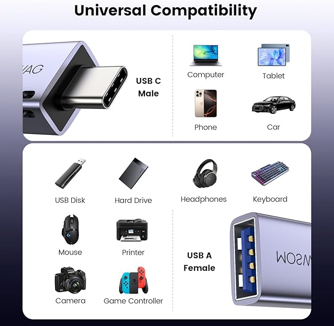 - [Compatibility] This USB C to USB 3.0 adapter is used for iPhone 15/16 Series and Android Phone, MacBook Pro after 2016 and MacBook Air after 2018 and most of the laptops, tablets and smartphones with a USB Type C port.