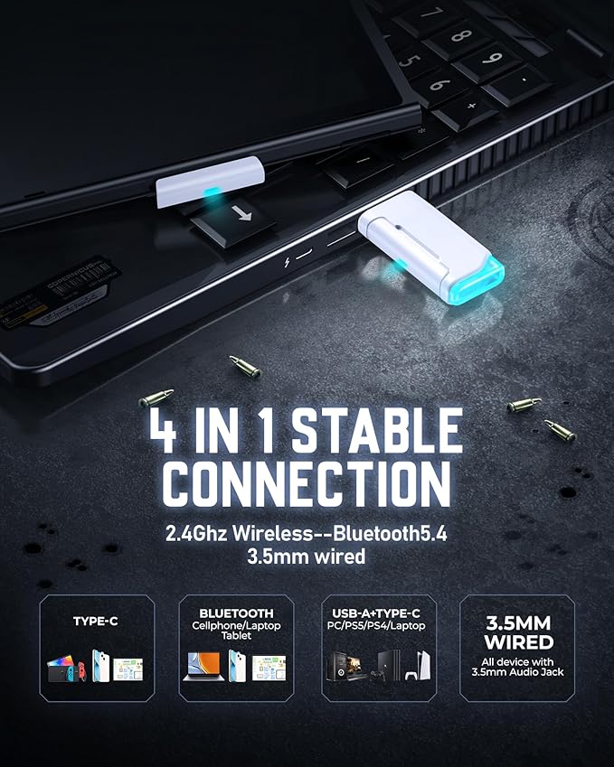 - 🎮【4 in 1 Multi-platform Compatibility】Unique 2 in 1 connection design (equipped with both USB-Adapter & Type-C dongle) make this wireless headset widely compatible with playstation 5, PS4, PC, Mac, phone, pad, Nintendo Switch (Invalid Microphone); Bluetooth mode of the headset is compatible with Mobile phone, Tablet, iPad and other smart devices. Extra 3.5mm Aux cable is provided for other game controller with 3.5mm port.