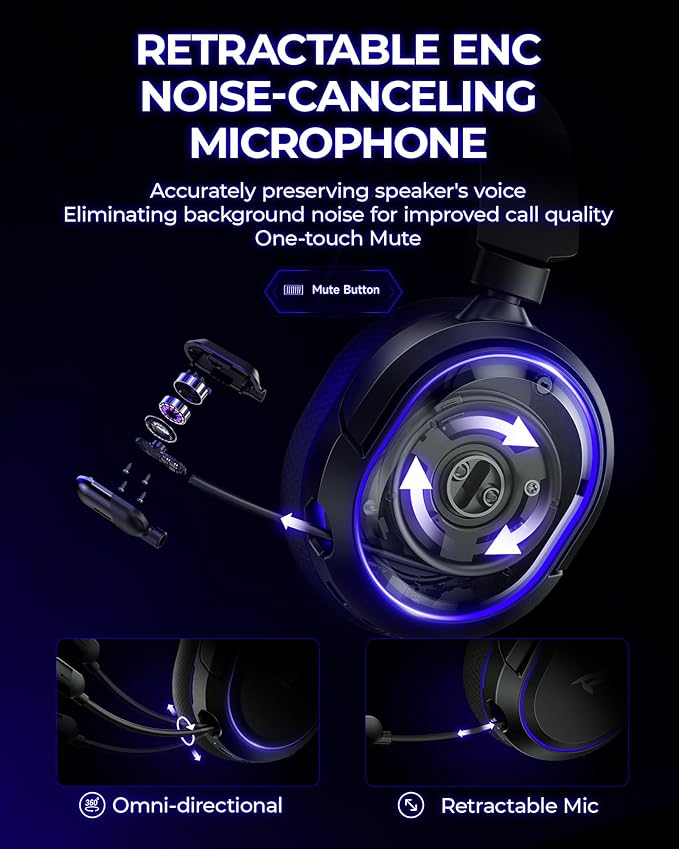 - 🎙️【Retractable ENC Noise-Canceling Microphone & One-touch Mute】Equipped with a 360° omnidirectional Noise-Canceling microphone. Our wireless headset can accurately calculate the speaker's direction, preserving the target voice while eliminating background noise for improved call quality. Gaming headsets with mic ensure your voice are relayed in high-definition clarity to your teammates, even in the heat of battle. Meanwhile, the retractable microphone combines the advantages of various types of microphones: ultra-low latency, high sound reproduction, concealability, and portability, the perfect gift for gamers and music enthusiasts.