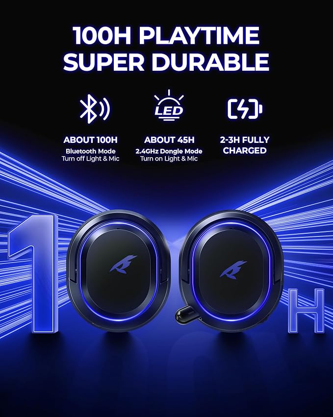 - 🔋【Extraordinary 100-Hour Battery Life & Support Use While Charging 】Valorise PS5 headset has a sustainable game time of 45-100Hrs. 100-hour playtime via bluetooth mode, turn off RGB lights and microphone. 45-hour playtime via 2.4GHz dongle mode, turn on RGB lights and microphone. With a low battery alert for timely recharging, our wireless PS5 headset supports simultaneous charging and use. Even if it runs out of battery, 3.5mm headphone jack is still available for console gaming using. Full-recharge in just 2-3Hrs.
