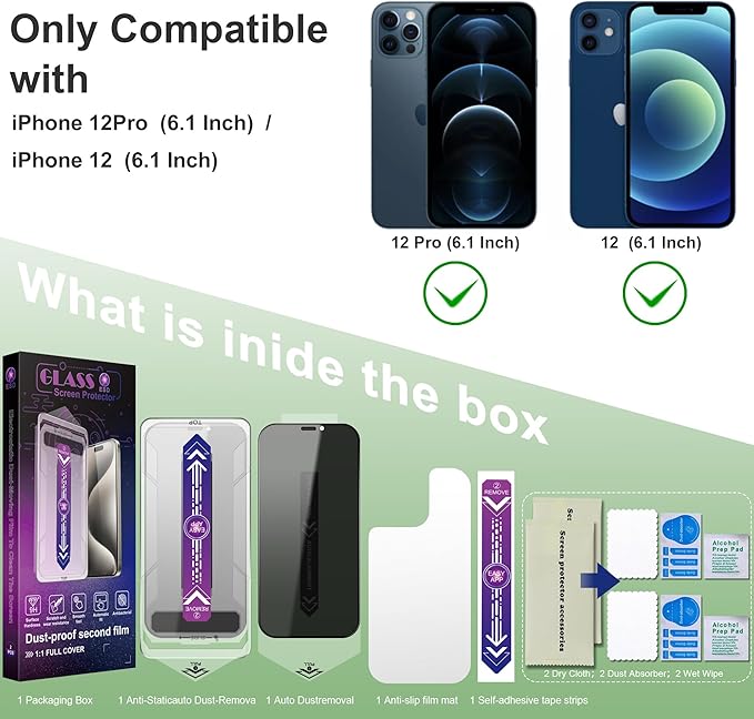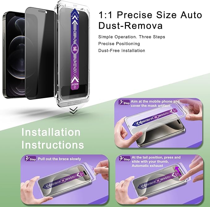 - Automattc Dust Removal Technology:Say goodbye to installation hassles with our iphone 12 screen protector! Simply close and pull to automatically align and remove dust—no more worries about air bubbles or dirt. Watch our installation video for easy steps and tips for the second pack. Perfect for those using a privacy screen iphone 12 pro