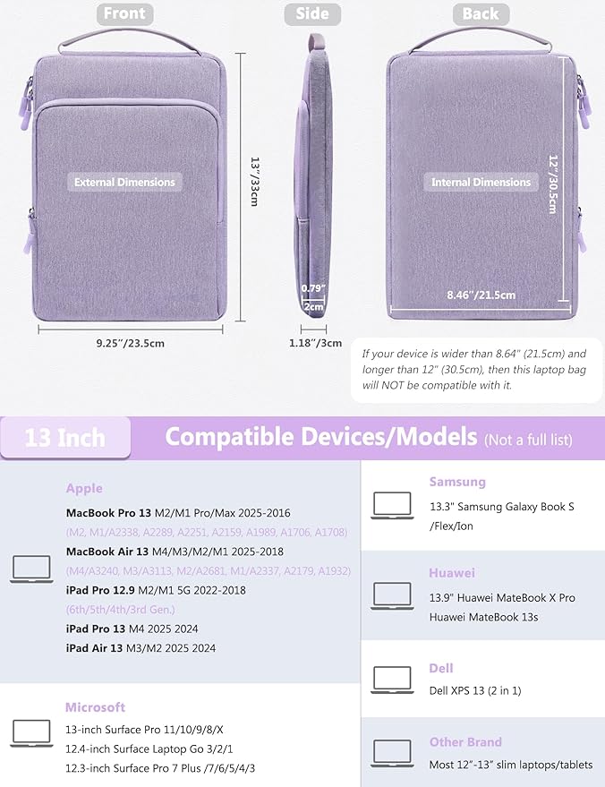 - Internal Dimensions: 12" x 8.46" x 0.79". Compatible with MacBook Air 13 M4/M3/M2/M1 2025-2018 (A3240, A3113, A2681, A2337, A2179, A1932), MacBook Pro 13 M2/M1 Pro/Max 2025-2016 (A2338, A2289, A2251, A2159, A1989, A1706, A1708), iPad Pro 13 M4 & iPad Air 13 M3/M2 2025 2024, iPad Pro 12.9 2022-2018, 13"-12.3" Surface Pro, 12.4" Surface Laptop Go, Dell XPS 13, 13.9" Huawei MateBook X Pro, Huawei MateBook 13s, 13.3" Samsung Galaxy Book S/Flex/Ion, and most 12"-13" slim laptops/tablets, etc.
