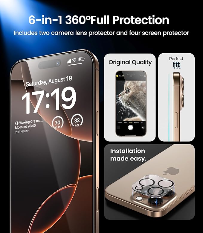 - 💎 [Easy Installation] The installation process is simplified! With the automatic alignment feature, you can enjoy a quick and effortless setup. Just slide it on in a few seconds, and the screen protector will perfectly fit your iPhone 16 Pro Max[6.9"] screen. No more worries about alignment or bubbles; installation has never been easier.Friendly Reminder: Please watch the installation video before starting.