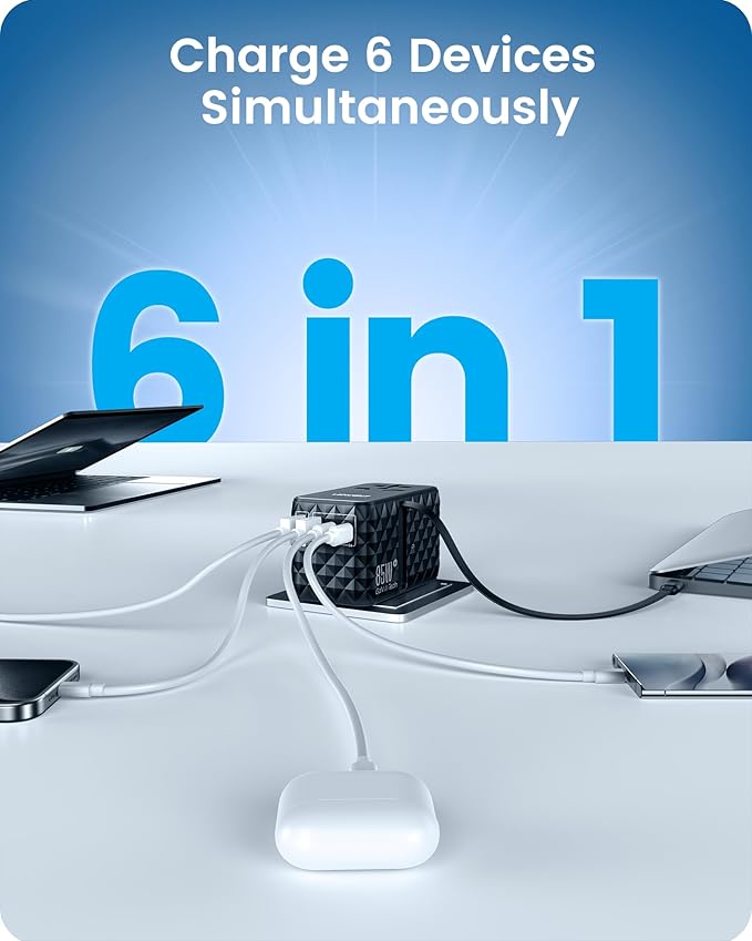 - 6-In-1 Travel Universal Adapter: This universal plug adapter converts 4 different plugs (USA, EU, UK, AUS) into 1 universal AC socket (250 V/10 A, 2500 W Max), 4 USB-C, and 1 USB-A, allowing you to charge 6 devices simultaneously without carrying extra wall adapters or USB chargers