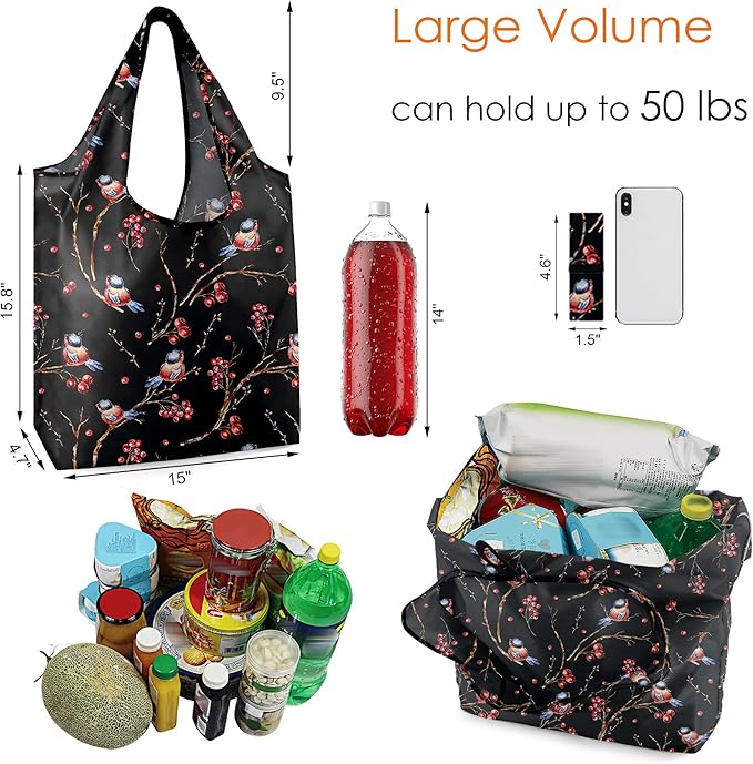 - X-LARGE CAPACITY & DURABLE: Our shopping bags for groceries measure about W15"*H15.8"*D4.7" with the 9.5-inch handle which can easily hold 50 Lbs or 2-3 shopper bags of stuff. All tote bags bulk are made of polyester fabric which is lightweight yet sturdy and all seams are reinforced with bias tape which makes reusable tote bags strong enough to pack heavy groceries, like canned goods, gallons of milk.