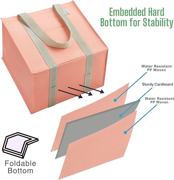 VENO 4 Pack Reusable Grocery Bags, Heavy-Duty Shopping Bags with Handles and Hard Bottom to Stand Upright, Foldable, Multi-Purpose, Sustainable (Peach Pink, 4 Pack)