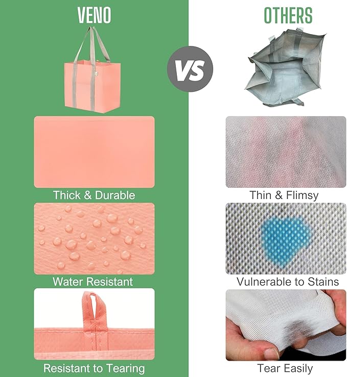 - Reusable & Sustainable to Protect the Environment – VENO reusable grocery shopping bags are created through maximizing the use of post-consumer material to make high-grade bags that save plastic from ending up in oceans, lakes, and landfills. Help us in protecting our environment to create a cleaner, more livable future. Collapsible and foldable for future use and easy storage in your car, glove compartment, kitchen, cabinet, drawer, luggage, or purse!