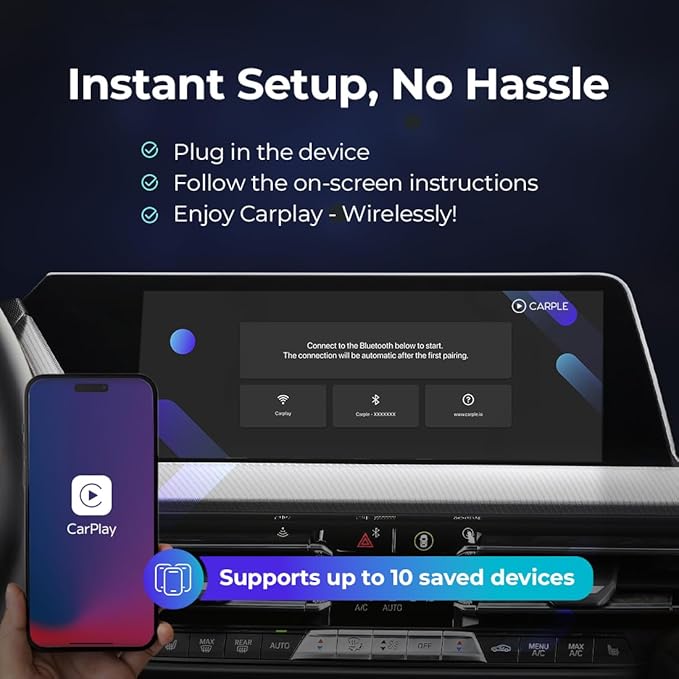- đ ăEffortless Setupă: Just plug in the adapter and follow the on-screen instructions on your vehicleâs displayâno extra steps, no hassle. After the first setup, it boots up in under 3 seconds every time you start your car, instantly reconnecting to your iPhone for a seamless, cable-free experience. Supports up to 10 paired iPhones and includes a USB Type-C adapter for added compatibility.