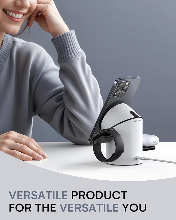 - 3-in-1 Wireless Charging Station : Charge your iPhone, Apple Watch, and AirPods simultaneously on one sleek platform. The compact cylindrical design of the CylinTrick-R saves space while offering efficient wireless charging for all your Apple devices
