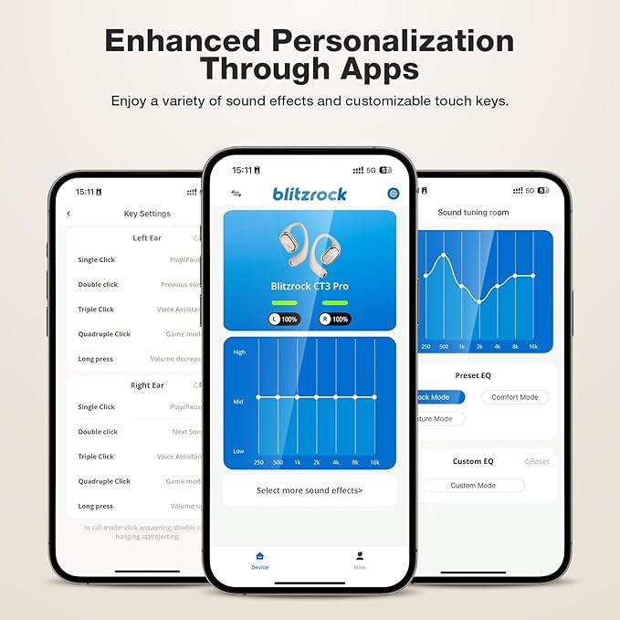- šš¢šš” šš§š ššššš¢š„šš ššØš®š§š: Enjoy the immersive sound field, bringing every instrument to life around you. The open ear earbuds feature unique pure HiFi and LISO balance technology for a rich, balanced audio experience. Because voices are so clear these are fantastic for audio books. The BlitzRock App offers both preset and customizable EQ settings, customizable touch keys