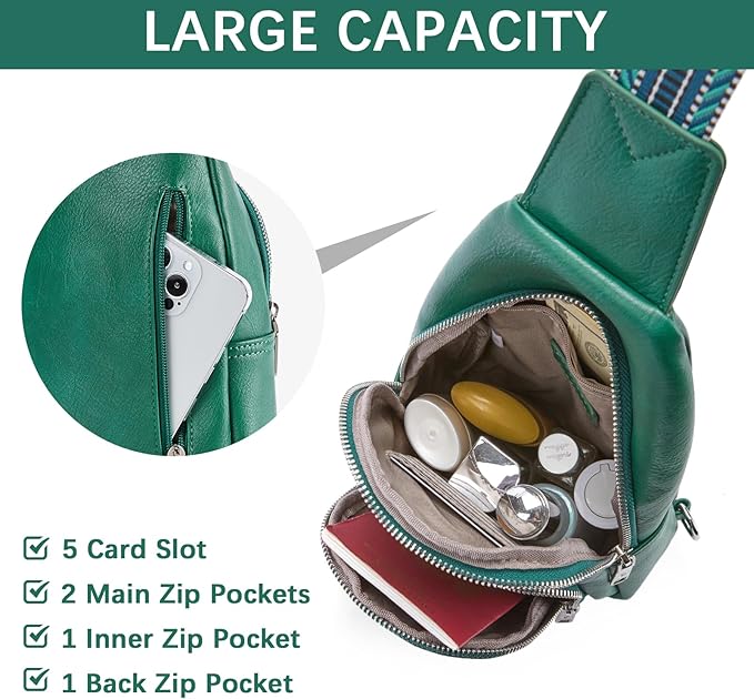 - Large Capacity, Stay Organized - This leather sling bag has 4 Zip pockets. The well-organized space accommodates your wallet, phone, sunscreen, cosmetics, keys, cards, and other necessary items. The five card slots provide convenient storage for your ID cards, credit cards, and transit cards, making them easily accessible