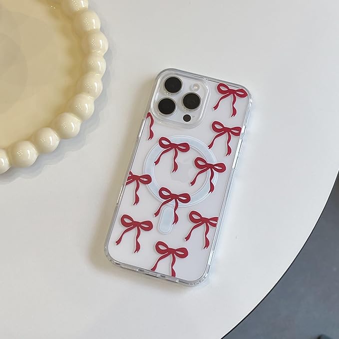 UEEBAI Magnetic for iPhone 13 Pro Max Case, Burgundy Bow Case Compatible with MagSafe, Wireless Slim Clear Ribbon Phone Cover Anti-Yellowing Shockproof Protective Cover for Women Girl - Burgundy