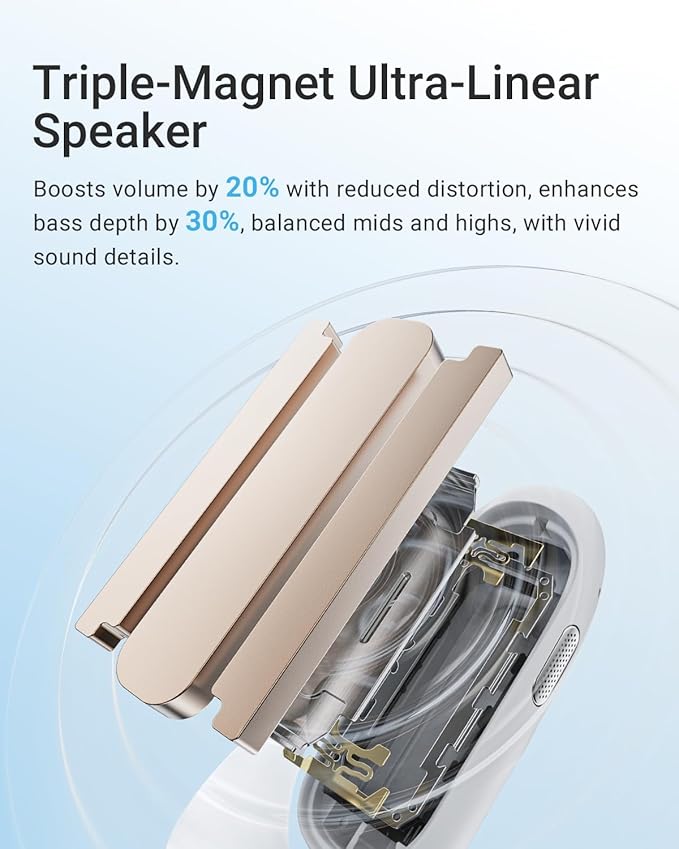 - Redefining Open-Ear Audio: Designed by Luxshare-ICT, this 3-magnet super-linear speaker sets a new benchmark for sound quality in open-ear headphones. With up to 0.5mm high amplitude and advanced diaphragm technology, it delivers deeper bass, clearer highs, and unmatched clarity—offering immersive, balanced sound for all-day comfort.