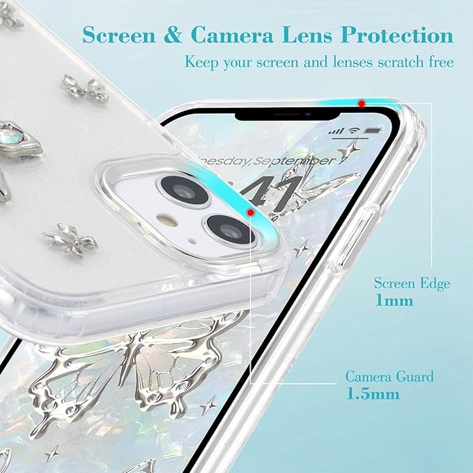 - Cute Fashionable Bow Design: Handmade 3D stereoscopic butterflies design, dotted with silver bows, the back of this case is sparkling transparent design, which not only shows the original appearance of the phone well, but also gives your phone a more stylish, lovely and exquisite kawaii appearance, adding unique charm to your phone. Using the glue drop sealing technology, the bows will not fall easily