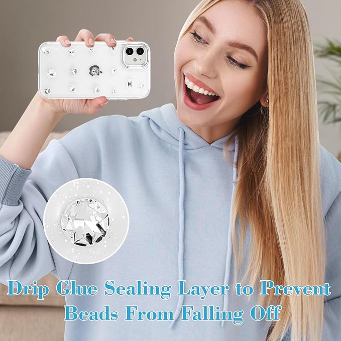 - Cute Fashionable Diamond Design: Handmade 3D stereoscopic crystal diamond craft. The back of this case is sparkling transparent design, which not only shows the original appearance of the phone well, but also gives your phone a more stylish, lovely and exquisite kawaii appearance, adding unique charm to your phone. Using the glue drop sealing technology, the beads will not fall easily