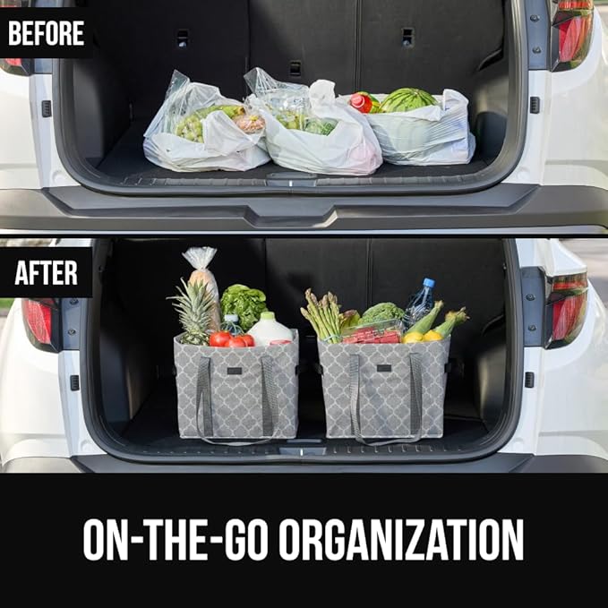 GORILLA GRIP Heavy Duty Foldable Reusable Grocery Bags, Tear Resistant Box Shape Shopping Tote with Reinforced Handles, Grip Feet, Easily Carry and Transport Groceries, 13x10x11, 1 PK, Quatrefoil Gray