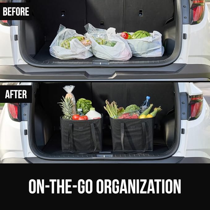 GORILLA GRIP Heavy Duty Foldable Reusable Grocery Bags, 3 Pack, Tear Resistant Box Shape Shopping Tote with Reinforced Handles, Grip Feet, Easily Carry and Transport Groceries, 13x10x11, Black