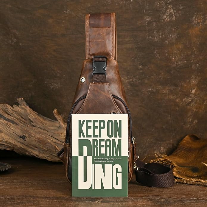 Le'aokuu Men Fashion Casual Tea Designer Travel Hiking Crossbody Chest Sling Bag Rig One Shoulder Strap Bag Men Leather 8015