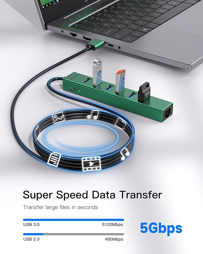 7 Ports USB 3.0 Hub, USB to Network HUB with 3.9ft Long Cable for Laptop, USB Splitter with Gigabit Ethernet Port and 5V/3A Power Port, MultiPort Aluminum Hub for iMac, PC, Flash Drives (Green)
