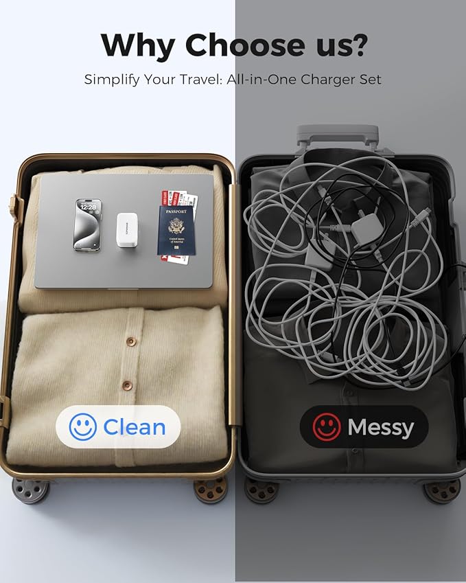 - [Best Choice for Travel Charger] Designed for travel, this 4-in-1 retractable USB charger block powers multiple devices with a single plug, eliminating the need to carry several bulky chargers during trips. With global voltage compatibility (100-240V, 50-60 Hz), it ensures reliable charging wherever you go. Its ultra-compact design, complete with rounded edges, retractable cables, and foldable plug, makes it easy to carry and prevents scratches on other items in your bag. Note: In certain regions like Europe, plug shapes may differ despite voltage compatibility. We recommend carrying a suitable adapter.