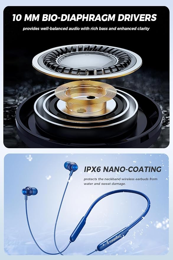 - [Powerful Deep Bass] Enjoy the pounding beat and immersive deep bass with TONEMAC neckband Bluetooth earbuds' 10 mm Bio-diaphragm drivers, moreover, Bluetooth 5.3 can effectively reduce the loss of sound transmission and restore all the details of your music to the greatest extent.