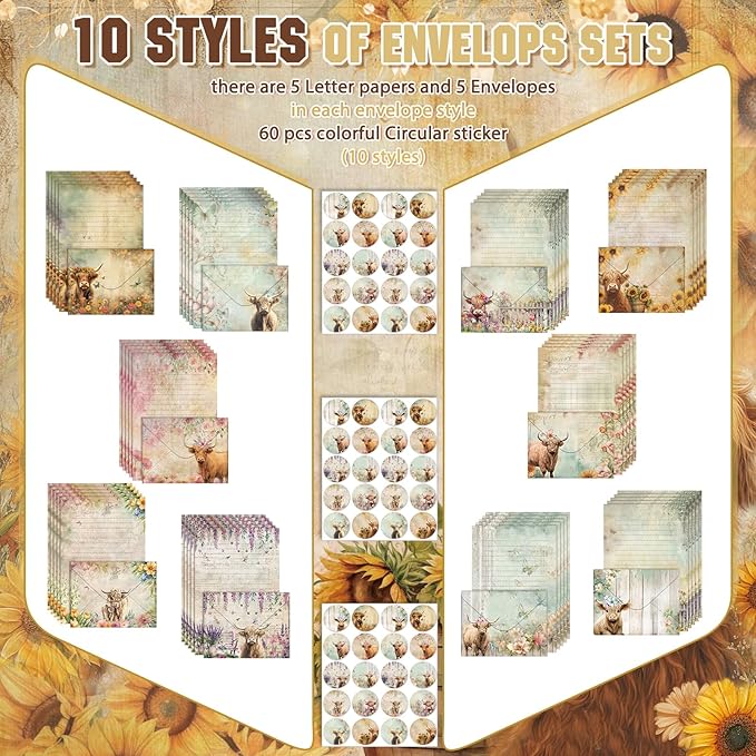 - Floral Highland Cow Paper Stationery Set: you will receive 50 stationery paper and envelopes letter sets, including 50 pieces of letter writing papers, 50 matching envelopes with 60 dot stickers; The sufficient quantity and rich designs cover your writing and sending needs