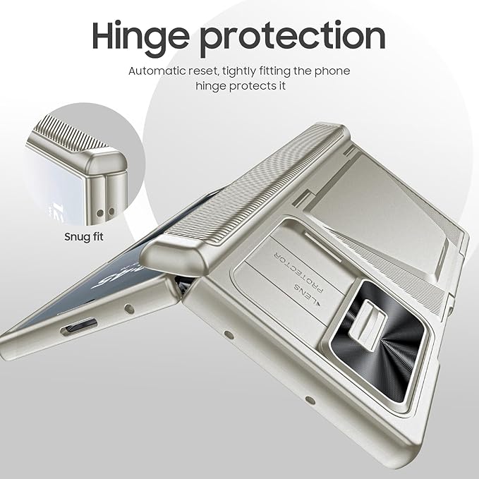 - Sliding Lens Protective Cover: This Galaxy Z Fold 6 case built in sliding camera lens cover. The newly designed sliding camera cover has a more sensitive slide rail and a safer lock than previous versions. The grinding mark on the lens cover and the raised side design allow you to slide the lens cover more easily. When you don't need to use the camera, you can fully cover the camera lens with just one second to protect your Galaxy Z Fold 6 phone lens from scratches and damage.
