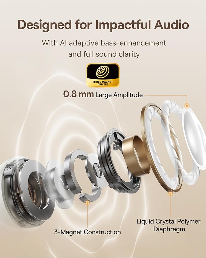 - [Impactful Sound with Anti-Leakage] : The Bowie MC1 open ear earbuds feature innovative 3-magnet construction and 0.8mm larger amplitude, which improves full sound clarity and soundstage width. AI adaptive bass enhancement dynamically compensates for bass and increases bass details. Directional sound tech minimizes sound leakage and renders the private listening experience.