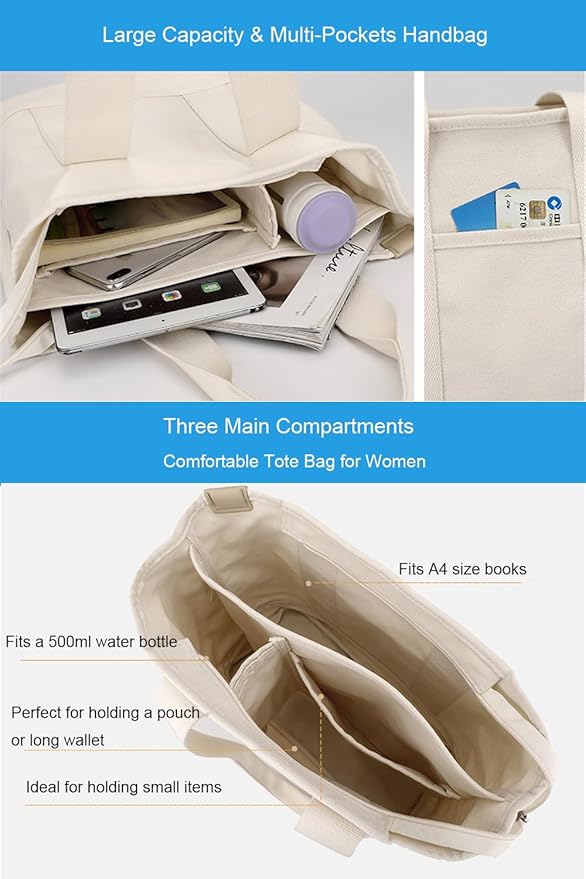 - Multi-Pockets: The canvas tote purse has 3 main compartments, 2 slip pockets; External: 1 front pocket. Allowing you to put your items in different pockets in an orderly manner.