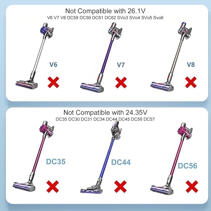 - ❌❌【Note】Not fit for V6 V7 V8 DC58 DC59 DC61 DC62 SV03 SV04 SV05 SV06 SV18 Slim SV15 Series; NOT Fit for Dyson DC35 DC30 DC31 DC34 DC44 DC45 DC56 DC57 Vacuum; Not Fit for Type B Battery.