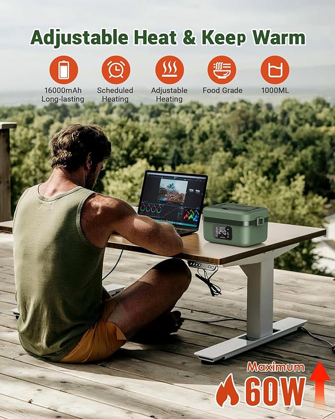 - [Adjustable Temperature & Keep Warm] -- The rechargeable electric lunch box for adults delivers 60W of power, higher than most products on the market, ensuring even heating. the food warmer offers adjustable temperature settings (194/185/176/167/158/149℉) and heating times (20/30/40/50/60 minutes). After heating, it automatically switches to keep warm mode.