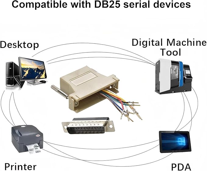 - DB25 male to RJ45 modular adapter can convert DB25 to RJ45 sockets (female), allowing you to establish a connection between devices with different interfaces.