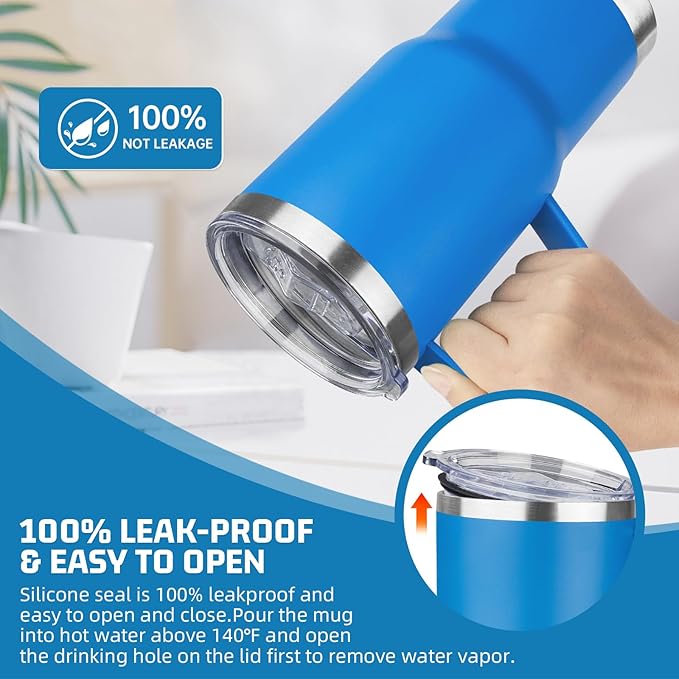 - COMFORTABLE HANDLE DESIGN: The handle of this travel coffee mug is ergonomically designed, the curvature of the handle fits naturally with the fingers, comfortable to hold, whether it is one-handed operation or long time holding, it can maintain a comfortable hand feeling and reduce fatigue. The material of the handle has been treated with anti-slip treatment, so that it can be held firmly even in a wet environment to avoid slipping off.