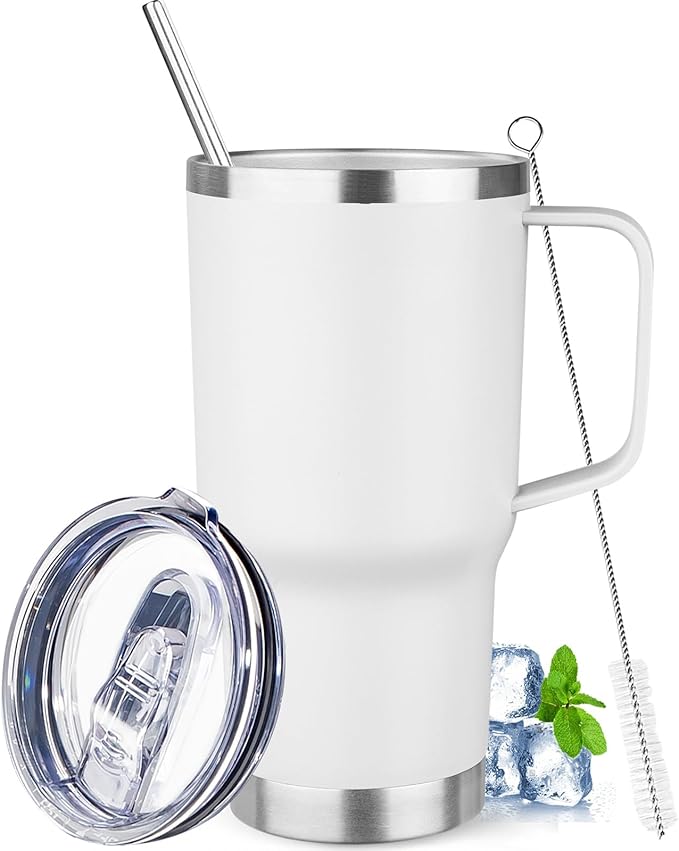 20 oz Tumbler with Handle Stainless Steel Insulated Coffee Mug Tumbler with Lid and Straw Double Wall Vacuum Insulated Coffee Mug Leak Proof Travel Mug Tumbler for Hot and Cold Drink (White,1pack)