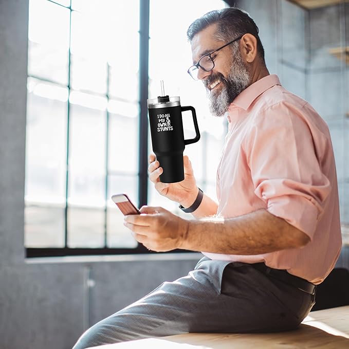 I Do My Own Stunts Tumbler - 40 oz Insulated Cup with Handle & Straw - Funny Get Well Gift for Men & Women, Broken Bone, Surgery Recovery, Knee or Leg Injury, Accident-Prone Coffee Mug