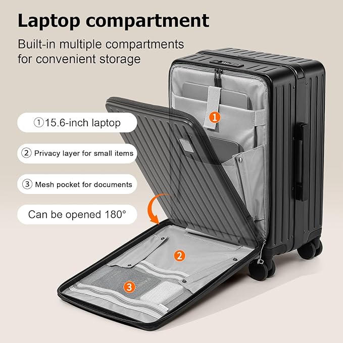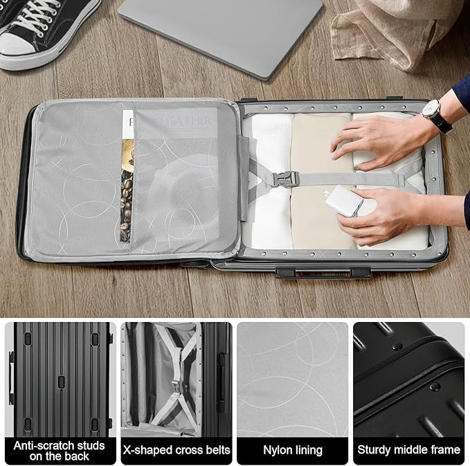 - Meticulous Storage: The interior of the hard case carry on luggage is equipped with X-shaped cross belts, which can effectively fix the luggage and avoid clutter of items. At the same time, the front opening cover of the luggage suitcase contains multiple storage pockets. The reasonable interior layout makes your storage more effortless and efficient