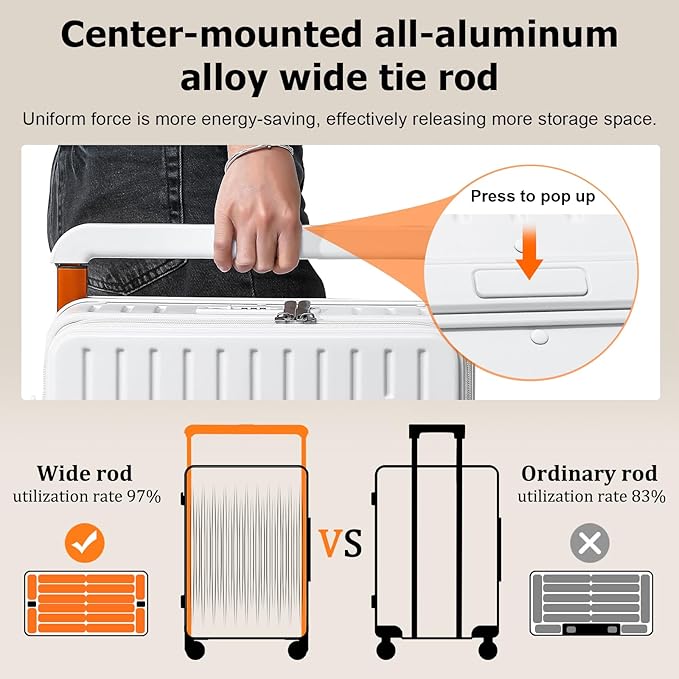 - Convenient Design: The carry on suitcase with wheels adopts a unique front opening cover design, allowing you to easily access commonly used items during the journey. The centered retractable wide pull rod can meet the needs of different heights, and it is smooth and effortless to push and pull. At the same time, the lowest gear position can be used as a handle.