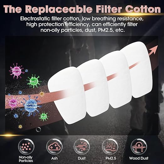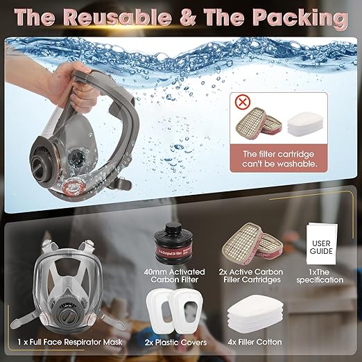 - 【Packing includes】The respirator mask set includes 1 pc reusable full face gas mask, 2 pcs 6001filter box, 2 pcs filter box covers, 4 pcs filter cottons and 1 pcs 40MM activated carbon filter.