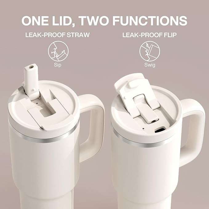 32 oz Tumbler with Handle and Straw: Stainless Steel Insulated Tumbler Keeps Cold for 24 Hours, Leakproof Travel Cup Fits in Cup Holder and BPA-Free, Cream Moon