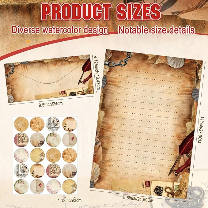 - Notable Size Details: each sheet of writing paper measures about 8.5 x 11 inches, and the letter envelope is about 9.5 x 4.125 inches; The writing paper should fit in the envelope in a right size