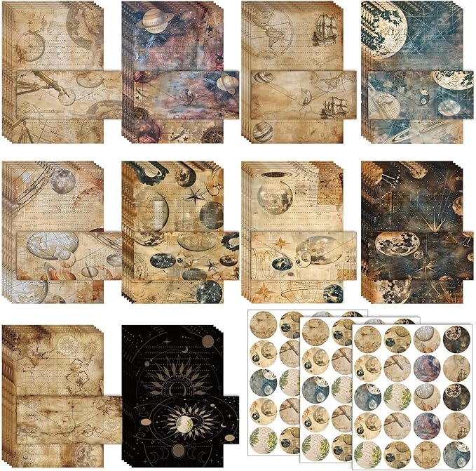 TaoBary 160 Pcs Stationery Paper Set 50 Double Sided Stationery Papers with 50 Matching Envelopes and 60 Round Dot Sticker, 10 Design(Space Moon Celestial,8.5 x 11 Inch)