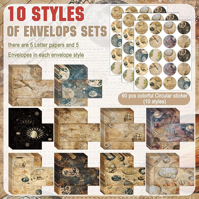- Space Moon Celestial Paper Stationery Set: you will receive 50 stationery paper and envelopes letter sets, including 50 pieces of letter writing papers, 50 matching envelopes with 60 dot stickers; The sufficient quantity and rich designs cover your writing and sending needs