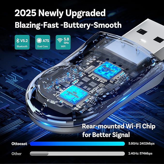 - 【Ottocast Mini Wireless CarPlay Android Auto Adapter】Upgrade your car with the Ottocast 2in1 wireless CarPlay adapter. It cranks out CD-quality audio through 5GHz WiFi for iPhone iOS 10+ and Android 11+, delivering sound 10x sharper than basic Bluetooth. Sleek design with REAL WIRELESS TECH—kick those cables to the curb and embrace pure wireless vibes! Perfect match with 98% of cars that supports Wired CarPlay/Wired Android Auto(❌Not for BMW/Tesla).