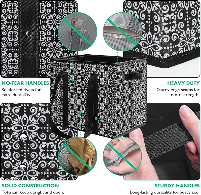 - Rigid Structure: The eco reusable grocery box is made of heavy-duty non-woven floral fabric (with water resistant coating) reinforced and stiffened with long lasting recycled cardboard insert on each side offering a rigid structure when opened.
